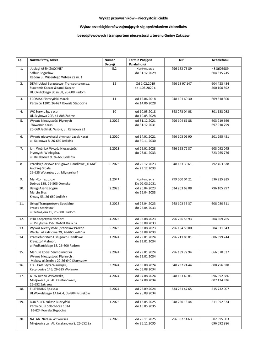 Wykaz podmiotów opróżniających zbiorniki bezodpływowe i transportujących nieczystości ciekłe.